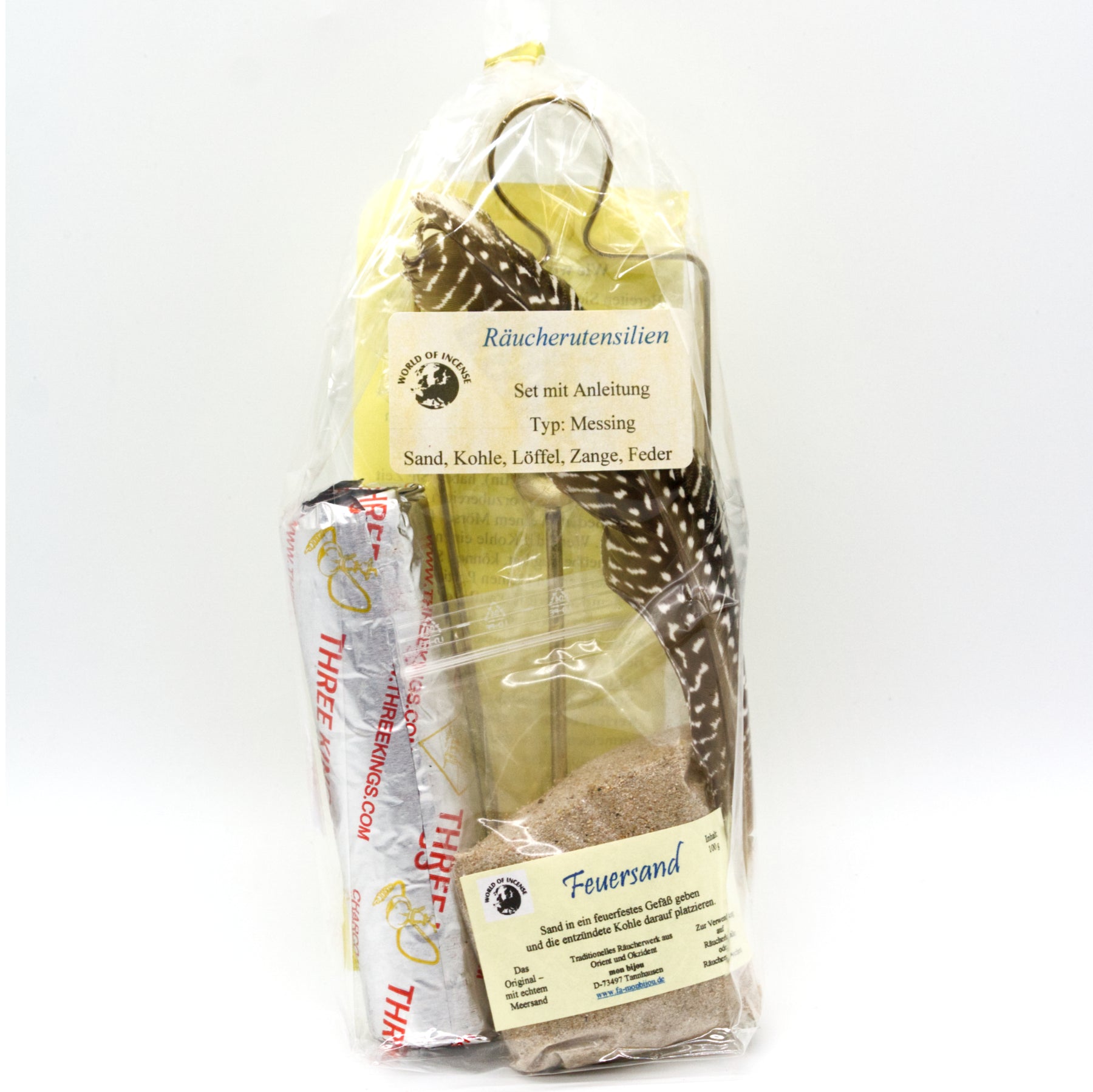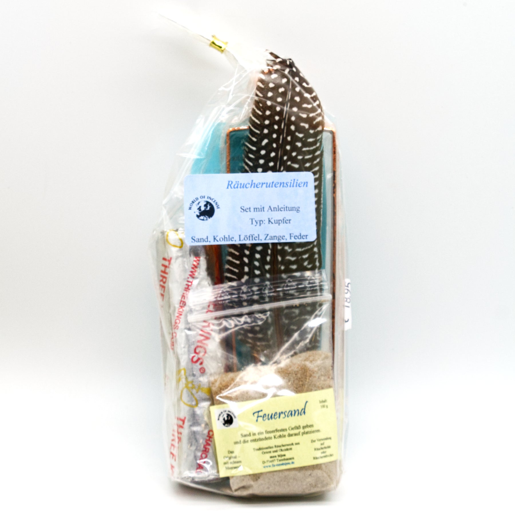 Das Set beinhaltet 100g Feuersand für deine Räucherschale, schnellzündende Räucherkohle, eine Zange für die glühende Kohle, einen Löffel für deine Harze und Räuchermischungen und eine Feder zum Verteilen des duftenden Rauches.